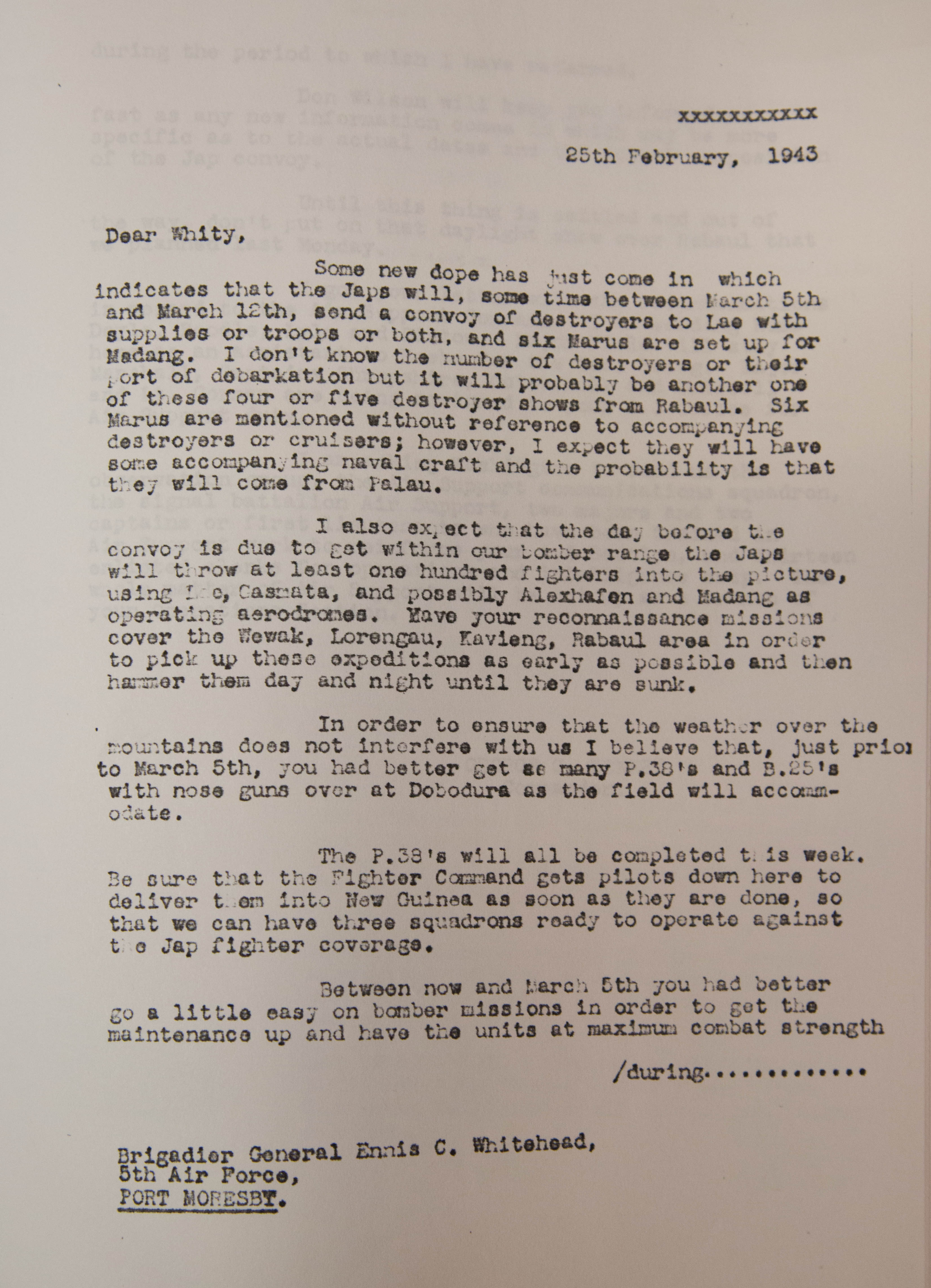 The document here was a message sent to General Enis Whitehead, deputy 5th Air Force commander whom General George Kenney had sent up to Port Moresby, New Guinea to establish the Advanced Air Echelon HQ there to ensure operations against the Japanese were better coordinated. This was Whitehead’s first notice that something big was afoot, offensive operations would need to be curtailed so the 5th AF’s bomber squadrons could be at maximum readiness for the coming battle.