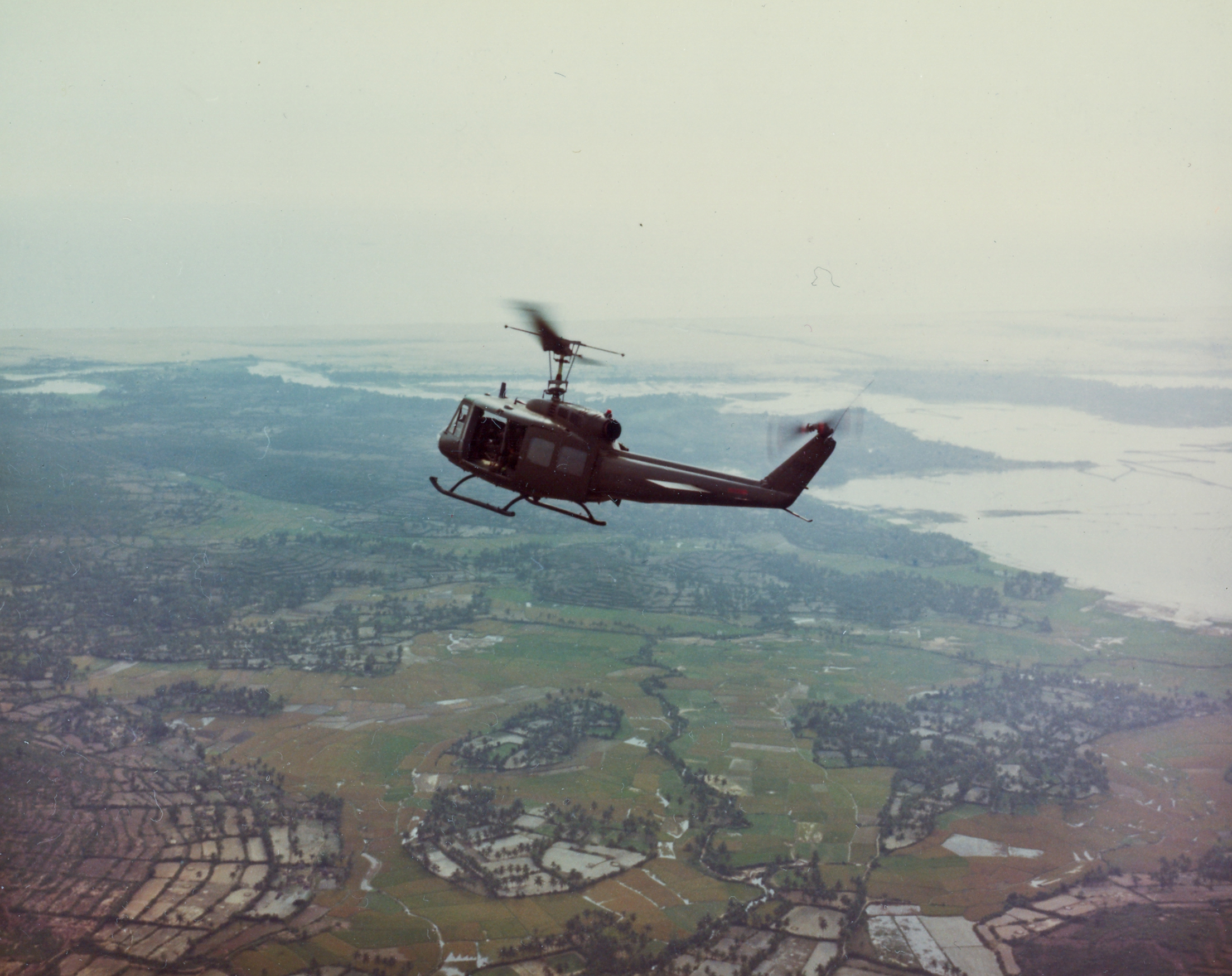 A Huey UH-1 Iroquois from the 35th Infantry Regiment over Phu Cat, Vietnam on April 11, 1967.