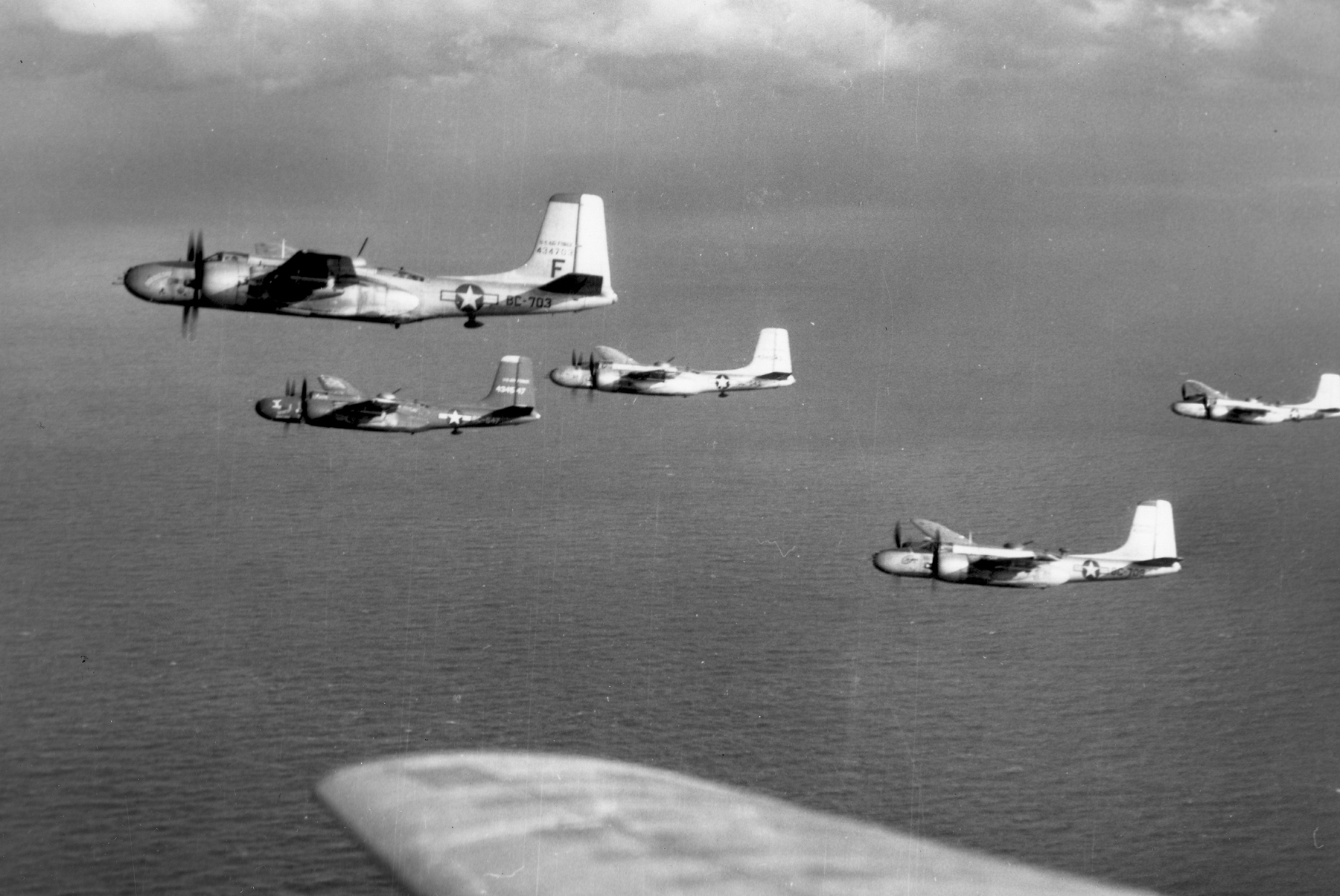 A 17th Bomb Wing B-26 returns after dawn following a night intruder mission in June 1953. The 17th had been a Martin B-26 Marauder-equipped bomb group that saw combat in North Africa and the MTO during World War II.