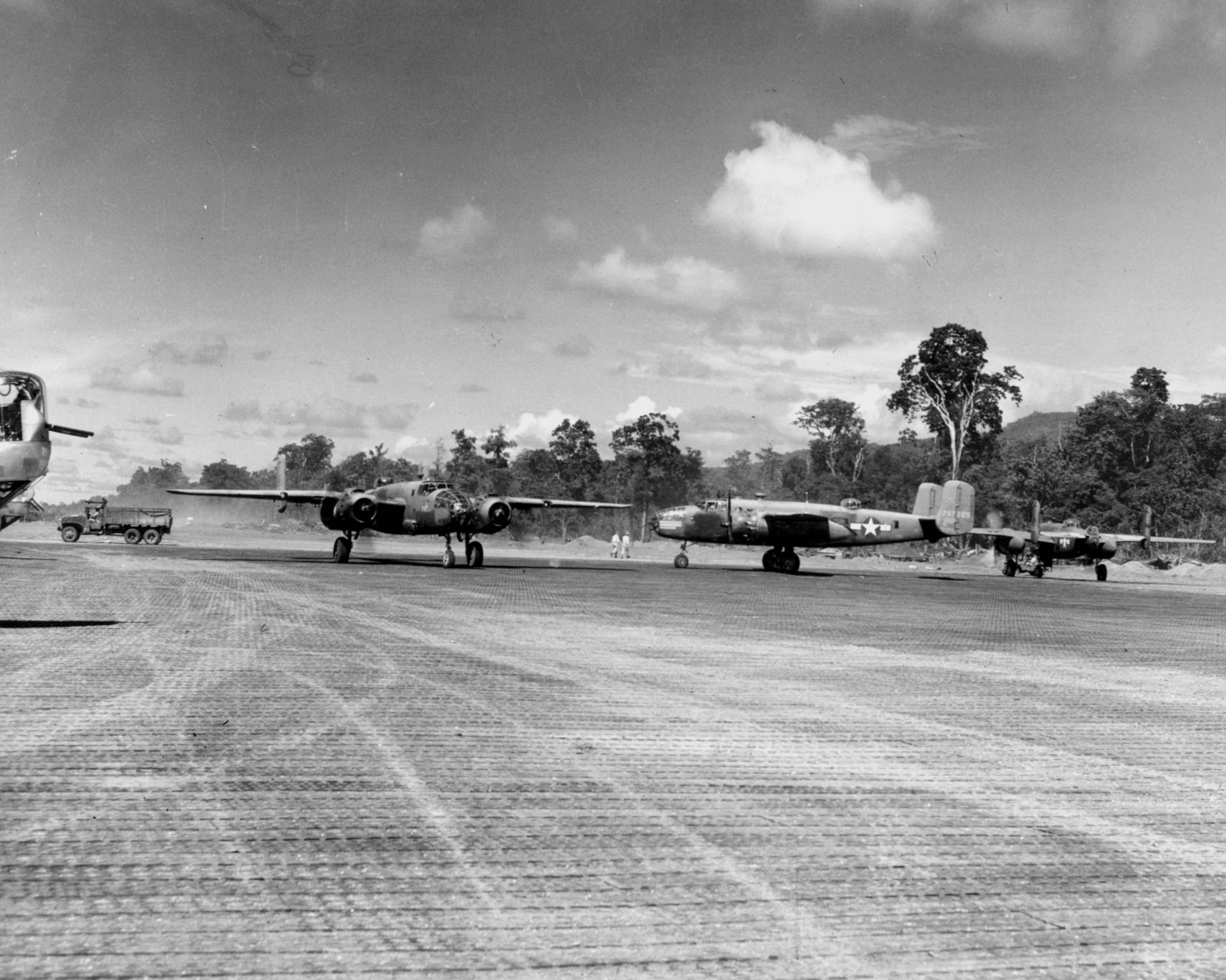 A 42nd Bomb Group Mitchell roars off target during a low-altitude strike against Sandakan, Borneo in the summer of ’45.