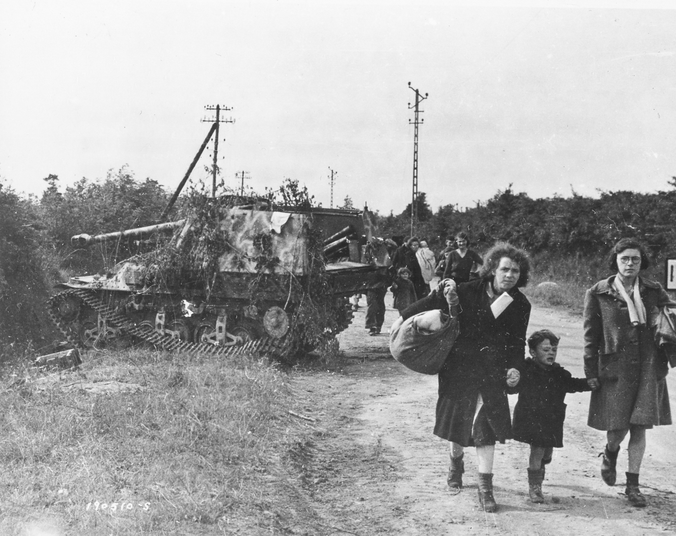 French refugees pass a wrecked German panzer jaeger Marder II as they flee the fighting in Normandy in the summer of 1944.