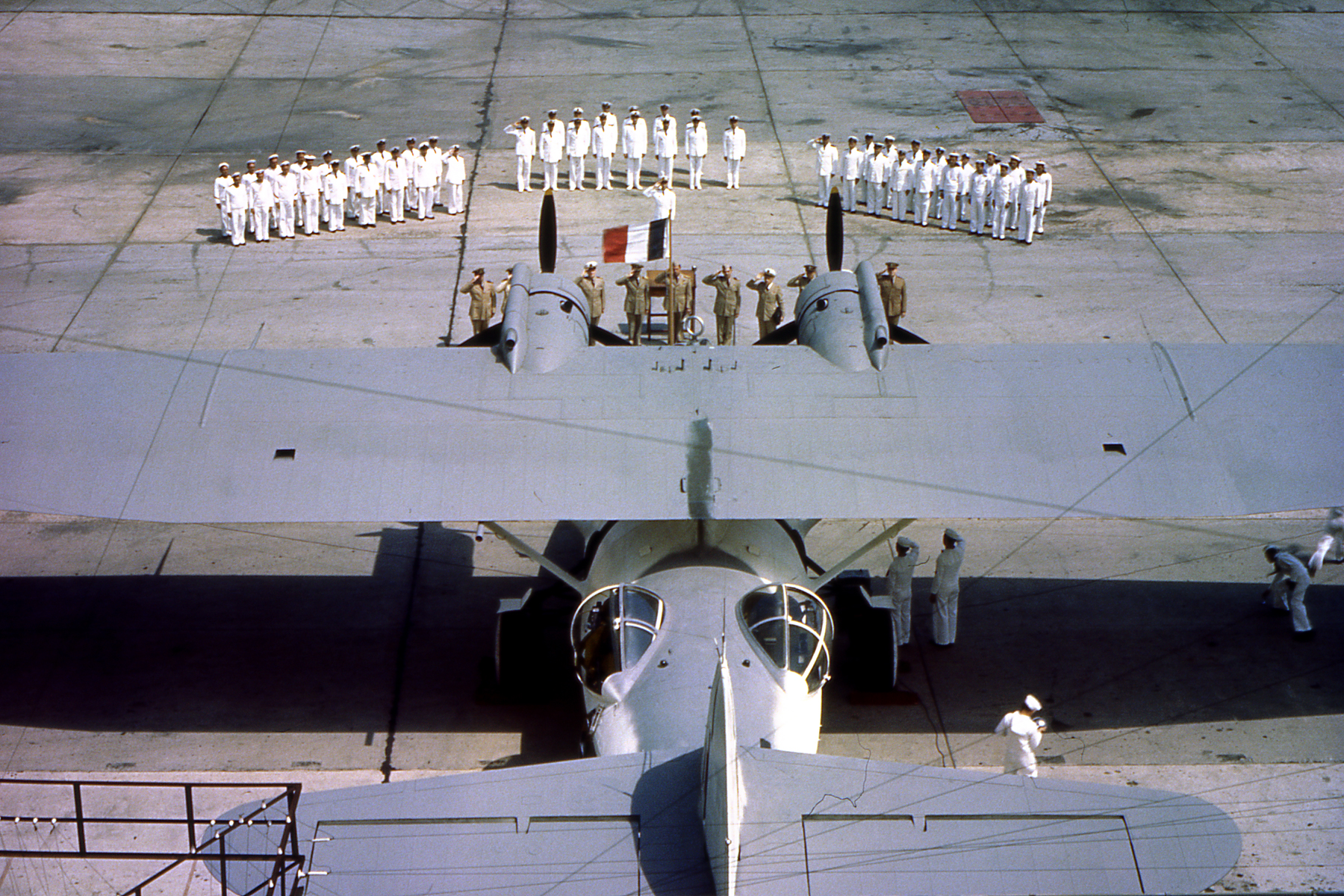 A French naval air force ceremony in front of an American-made Consolidated PBY Catalina.