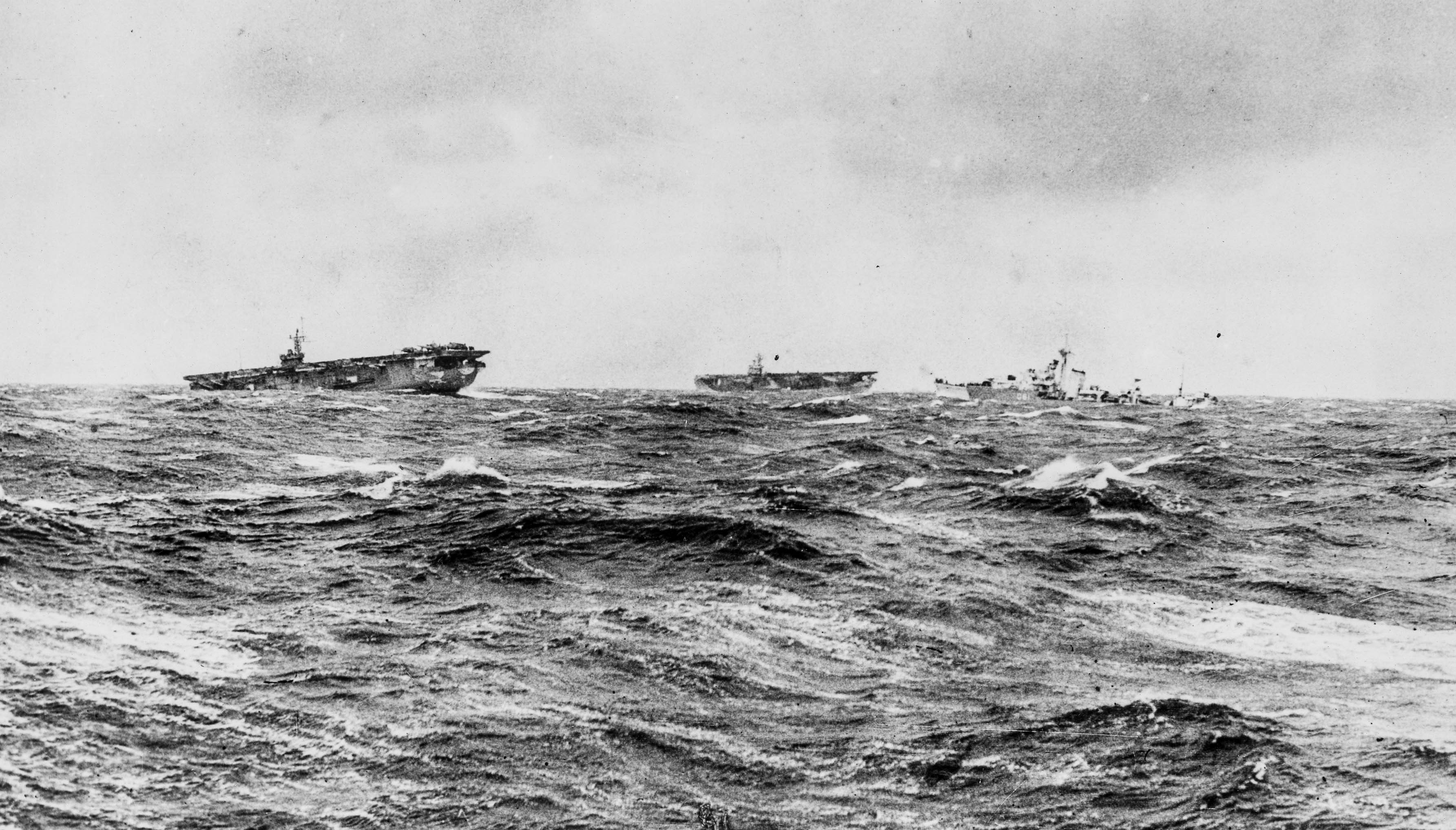 Two Royal Navy escort carriers, HMS Emperor and HMS Strike pitch in the heavy swells of the Arctic Sea during a convoy escort operation to the Soviet Union. An RN destroyer can be seen at right, providing the carriers with an anti-submarine screen.