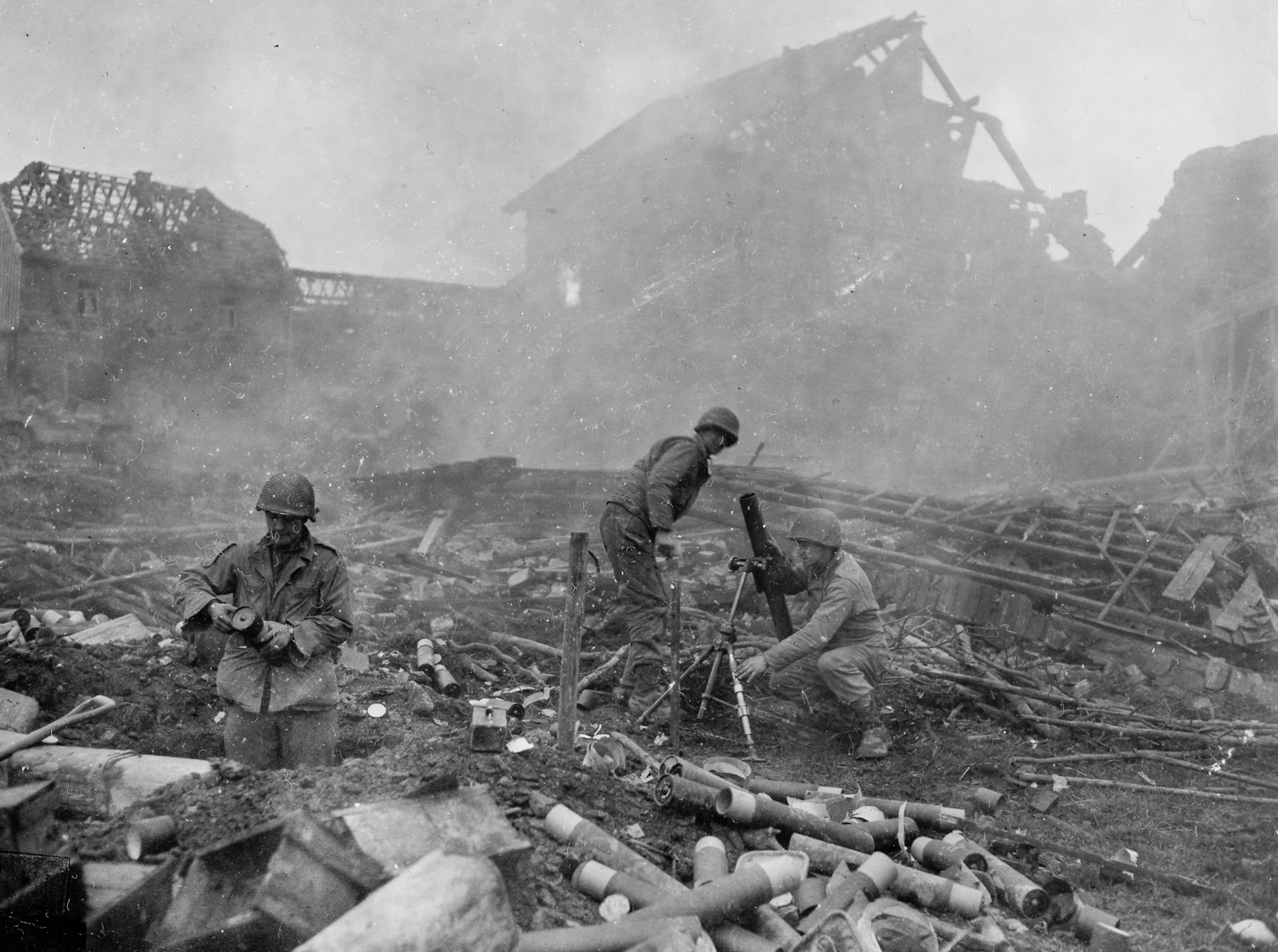 On of the 22nd Infantry’s 81mm mortar crews firing in support of the rifle companies holding off a German counter-attack at Grosshau on December 1, 1944.