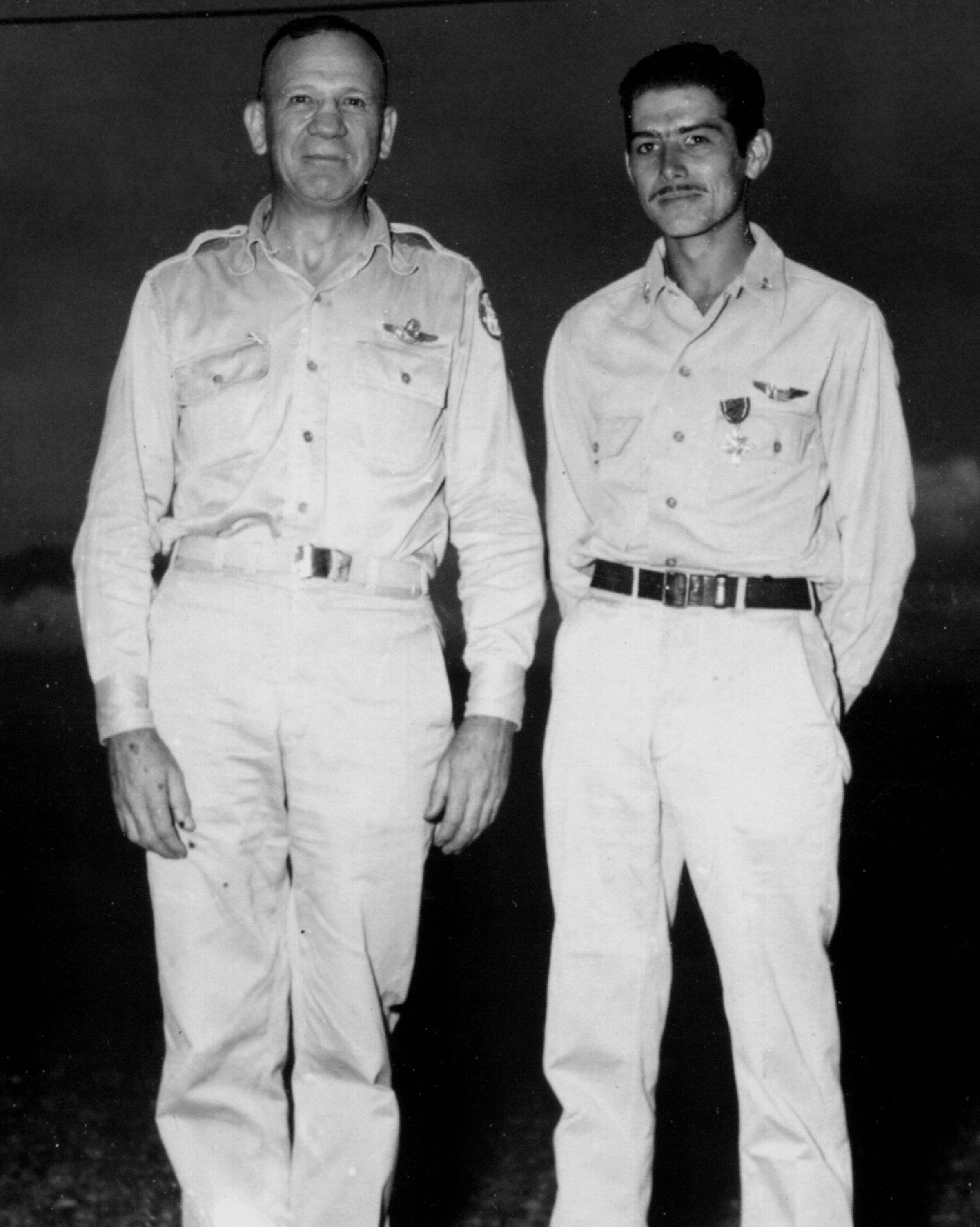 Gerald Johnson (at right). MIA October 7, 1945. He was lost in a typhoon off the coast of Japan less than a week before he was supposed to rotate home. He’d survived over 1200 combat hours and 265 missions in three tours that spanned the Aleutians, New Guinea and the Philippines.