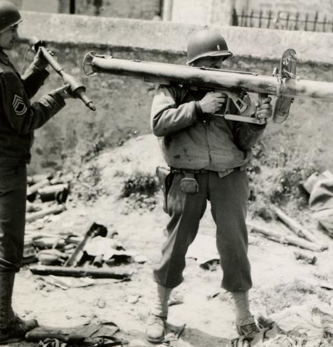 A captured panzerschrek under investigation by U.S. troops at St. Mere Eglise during the Normandy Campaign. Captured panzerschreks were sometimes used against the Germans since they proved more effective than American bazookas.