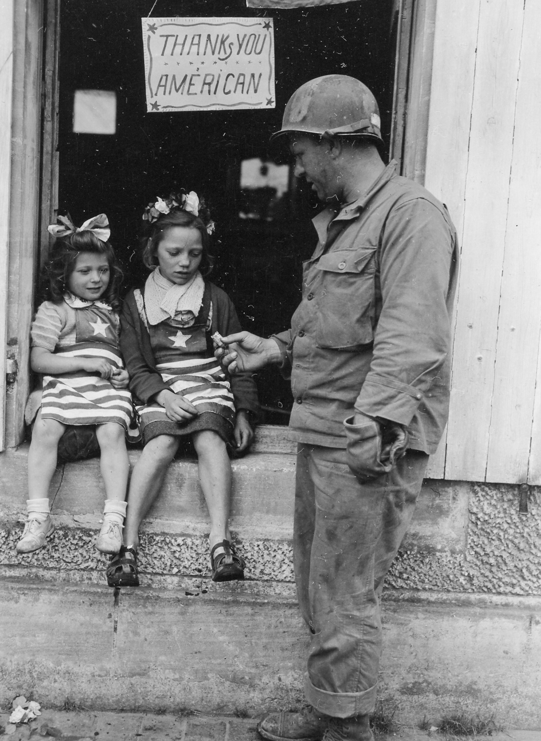 An American paratrooper in Normandy kneels down to chat with two French children. June 8, 1944.