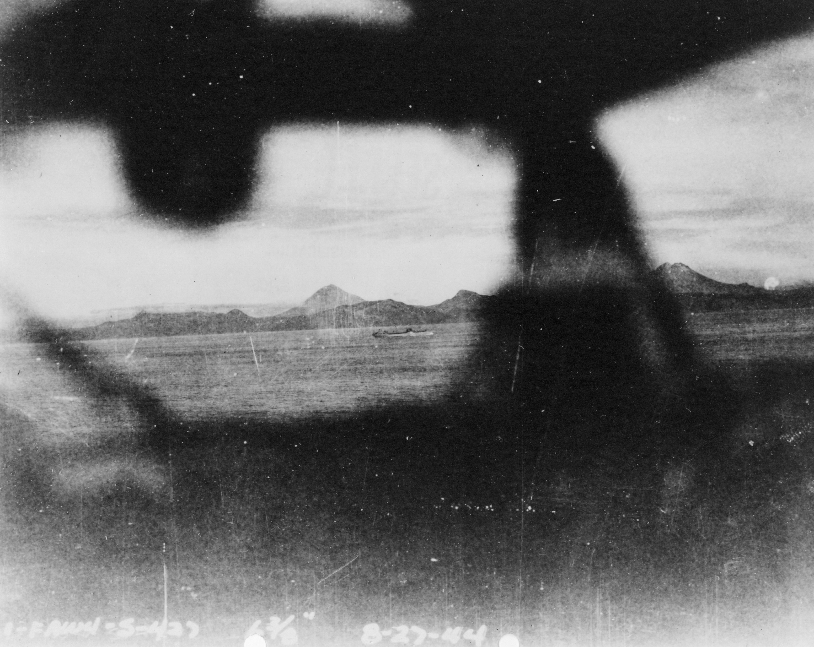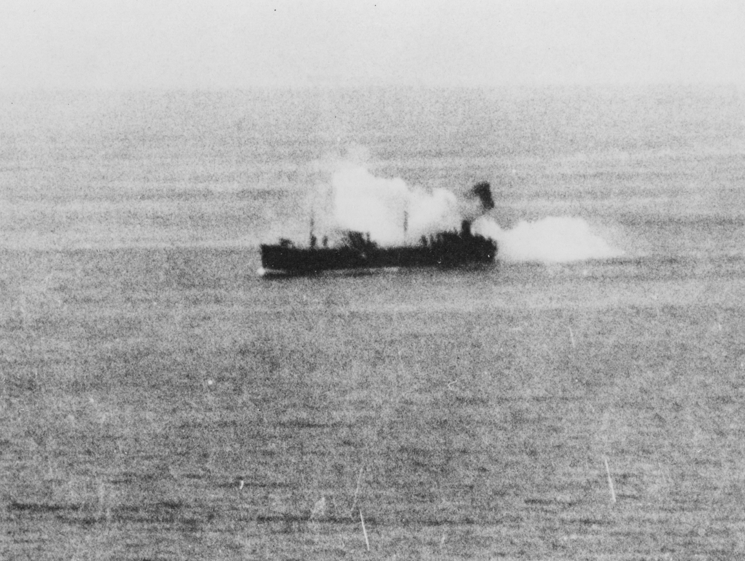 Price pulled up at the last possible moment, narrowly missing the tanker’s mast. As they cleared the area, Gavin snapped photos of the vessel burning, smoke boiling from the direct hit. It was a masterful masthead level bombing run, the sort perfected by the 5th Air Force, then passed on to the U.S. Navy’s bomber squadrons.