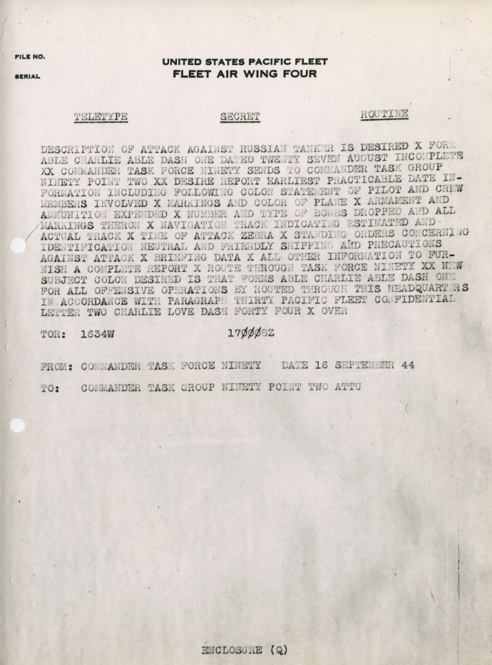 Except that the tanker was the Russian USSR Emba, a Suamico class fleet oiler built in Portland, Oregon. Completed in May 1944 she was handed over to the Russians as part of our Lend-Lease program at the end of June. The Russians had crewed it for only two months when Price’s crew put a hole in her hull.