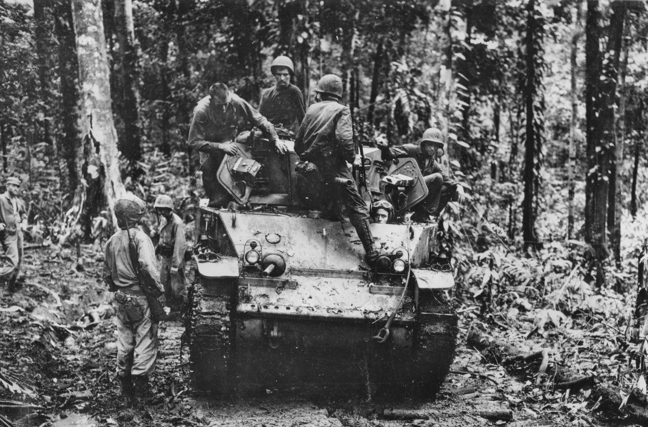 1st Marine Division M5 Stuart light tank crew taking a short break during the brutal fighting at Cape Gloucester, New Britain. January 16, 1944.