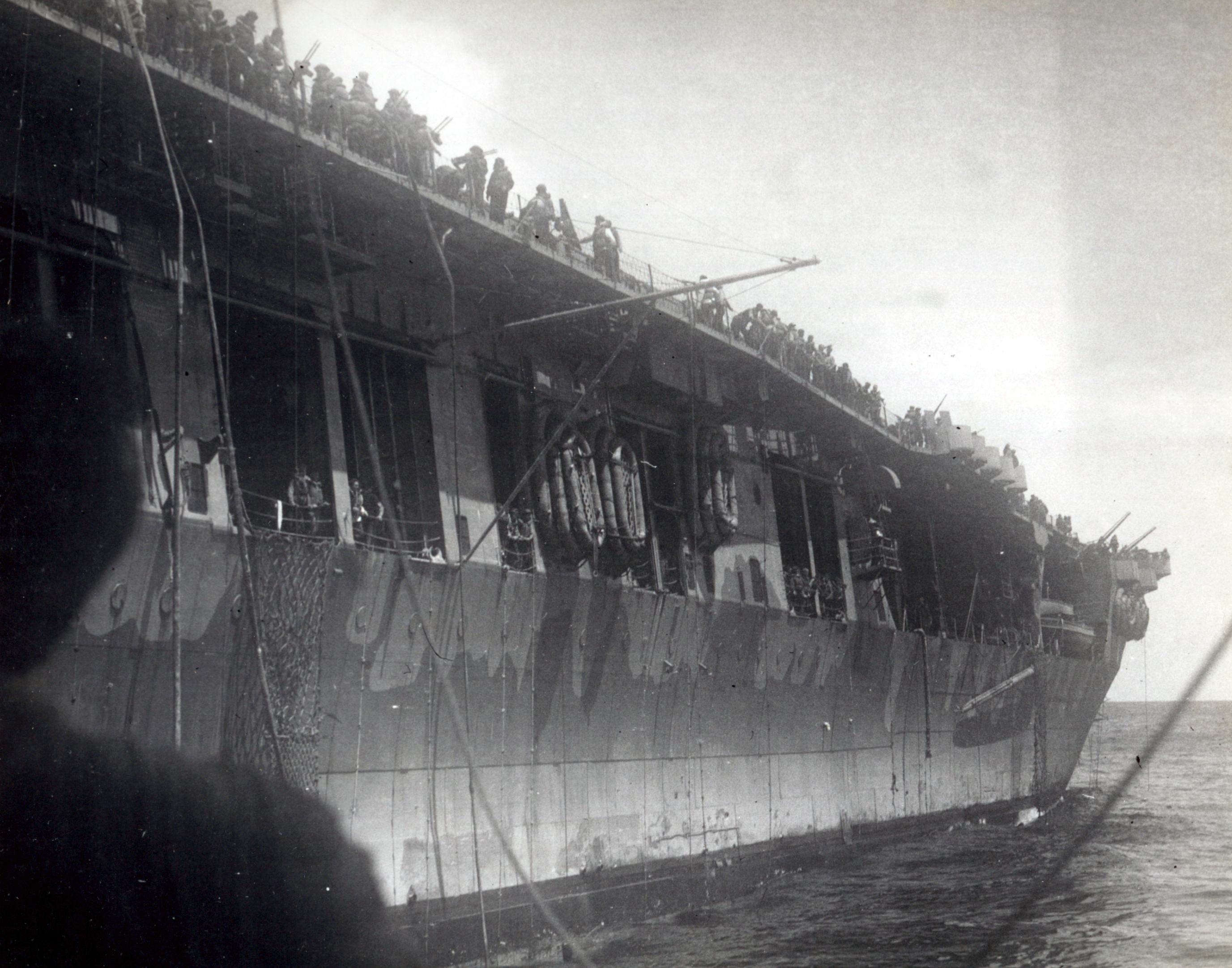 As the morning wore on, the crew managed to contain the fires and reduce the ship’s list to about 2 degrees. But with the engineering spaces flooded, the Hornet was not going anywhere under her own power. While the damage control parties worked, Bean and the other medical personnel moved the wounded to the ship’s fantail in the hangar deck. Eventually, they were all removed from the ship and taken aboard two destroyers.