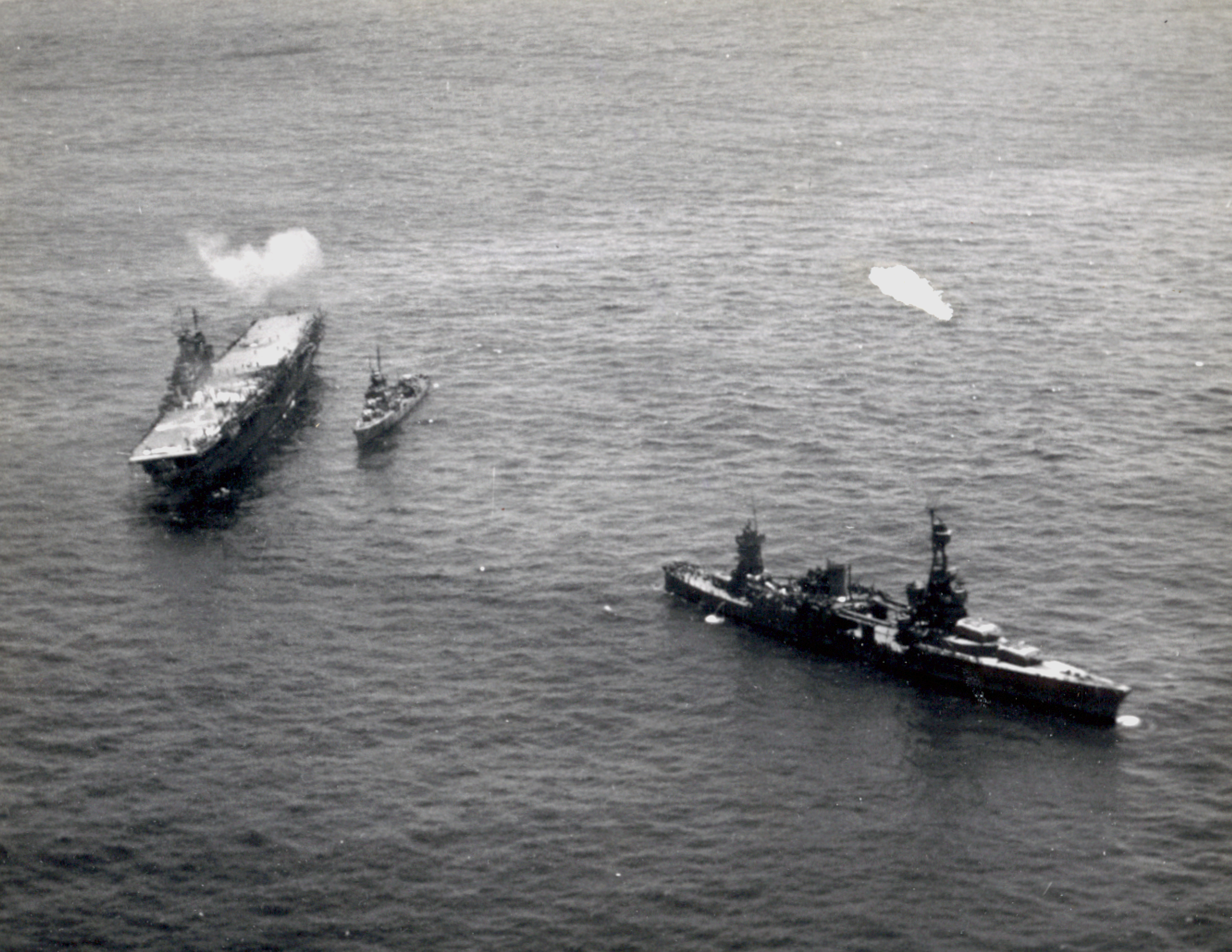 The vital carrier was abandoned late that afternoon, and efforts to tow her clear of the engagement failed. Her escorts attempted to scuttle her, but the ship defiantly remained afloat until finished off by a small Japanese surface task for that night.