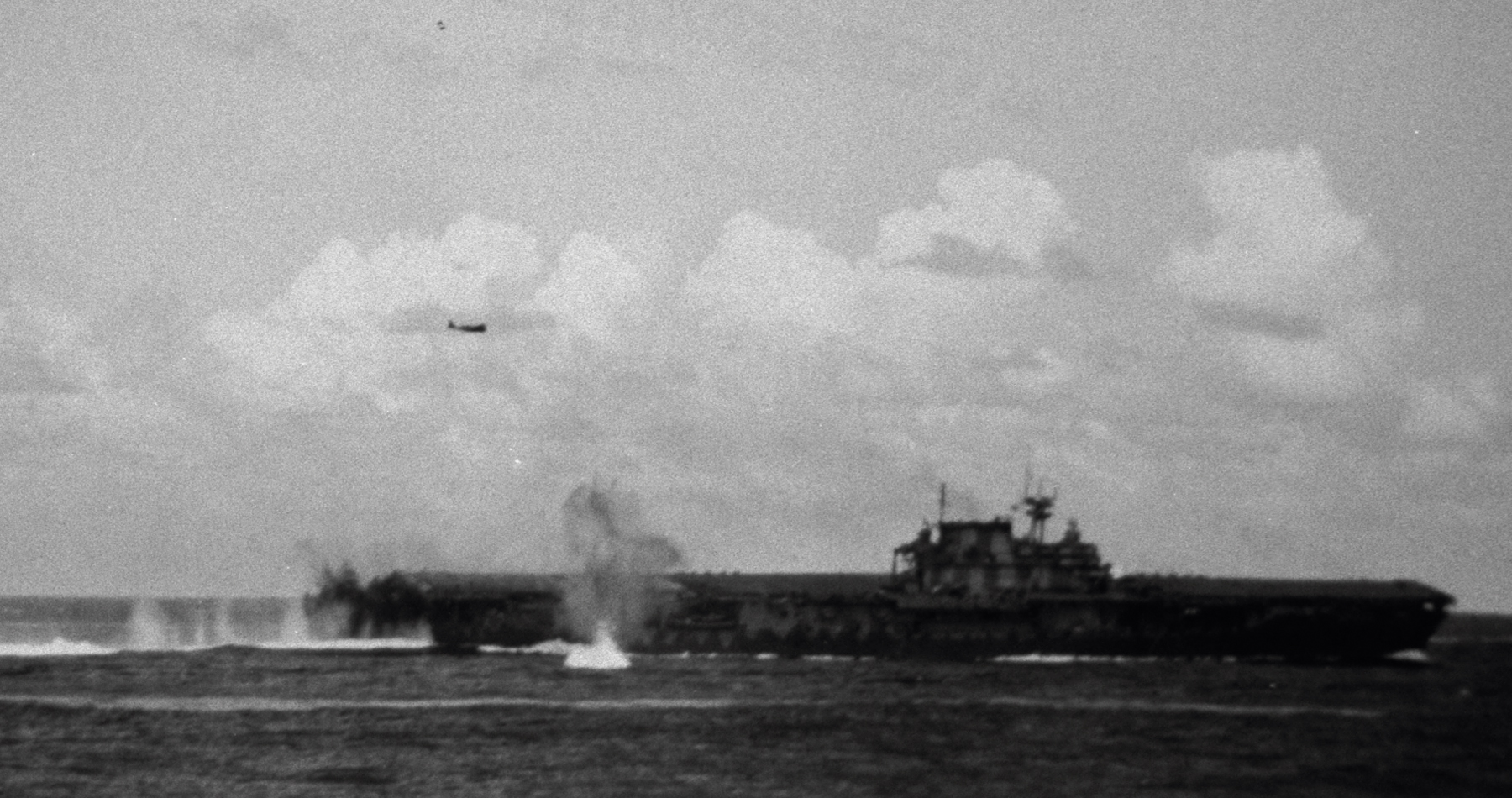 Bombers struck the Hornet again, and Bean was forced to take a helmet removed from a dead sailor and use it for his own protection. He lay on the deck watching the flak claw down several planes, but the Hornet shuddered once again as more weapons struck home. The list returned, this time edging past 15 degrees.