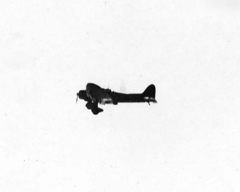 A Japanese Aichi D3A “Val” dive bomber hit during the attack on Pearl Harbor.