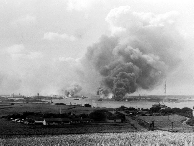 Pearl Harbor in flames.