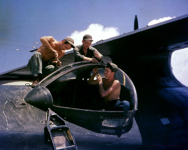 USN crew works on a PBY’s waist blister.