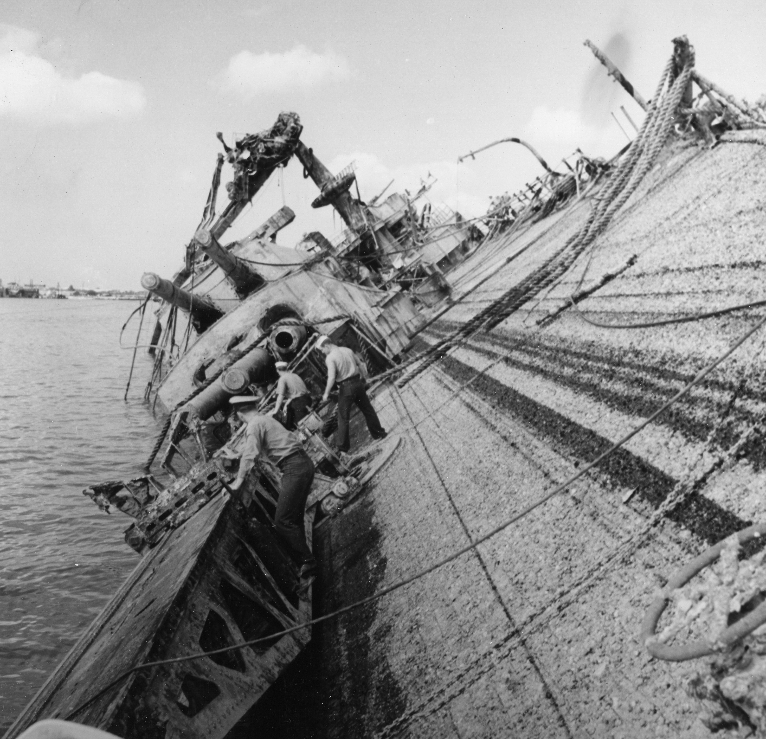 From the spring of 1942 to the summer of 1943, the salvage operation continued. Patches needed to be welded to the hull to cover the torpedo damage and make the ship watertight again. Teams of divers and workers cleared out ammunition, cut away damage and pumped out the thousands of gallons of fuel still remaining in the battleship’s tanks. As that work continued, other teams emplaced twenty-one massive winches on Ford Island. The salvage team rigged cables between the ship and the winches, and these were used to gradually pull the Oklahoma upright. It was a slow task that required intricate engineering work. After three agonizing months, the winches finally righted the wrecked battleship.