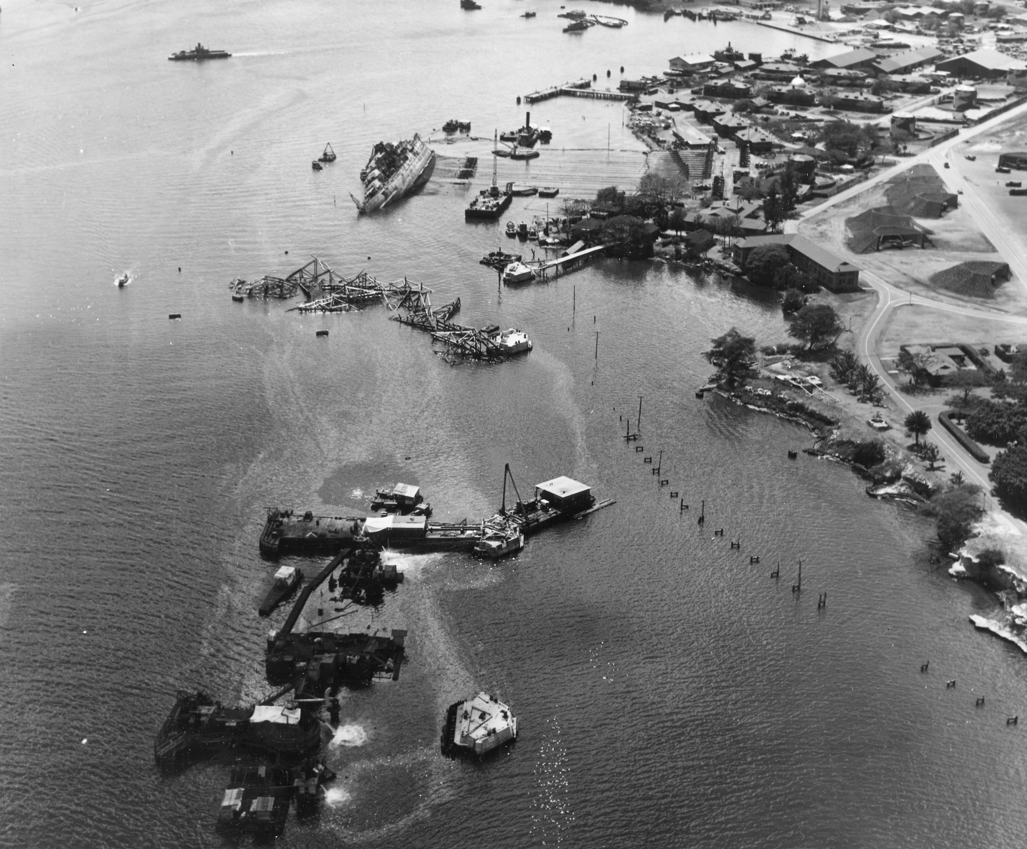 Righting the Oklahoma took almost 3 months. At bottom of the photo is the wreck of the Arizona, still leaking fuel. May 1943